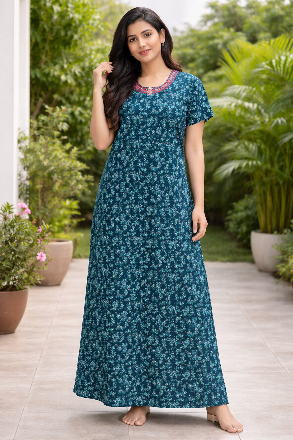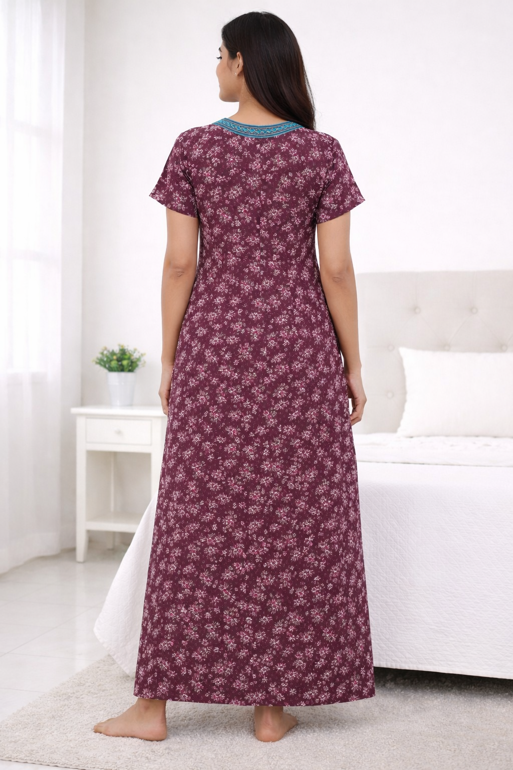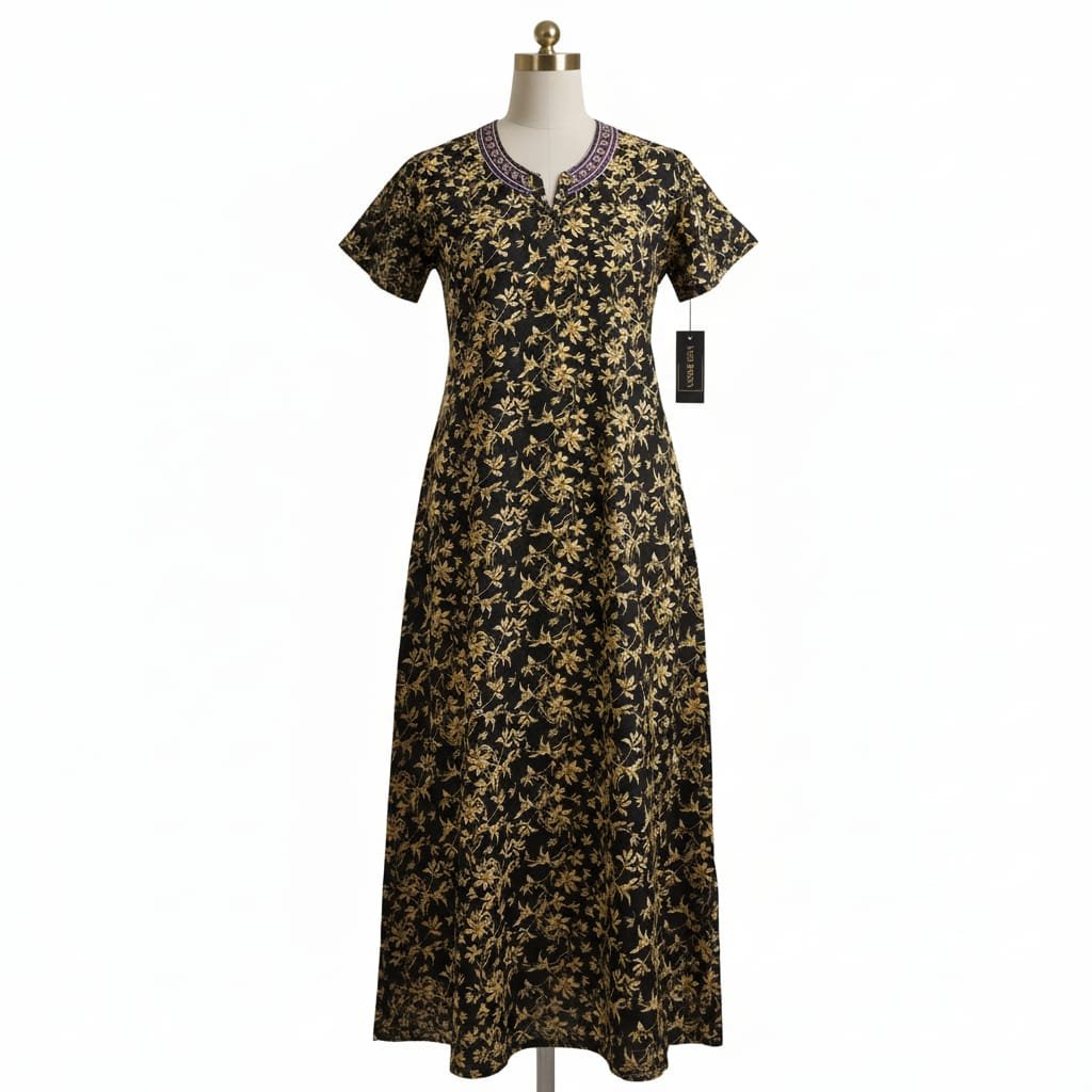 The women night wear with pocket.The round neck and short’s sleeves.The relaxed silhouette ensures unstriated movement while the soft cotton fabric keeps you cozy throughout the night.